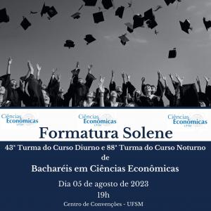 No dia 05 de agosto de 2023, às 19 horas, está marcada a Formatura Solene da 43ª Turma do curso Diurno e 88ª Turma do curso Noturno de Ciências Econômicas da UFSM. O evento irá ocorrer no Centro de Convenções e a outorga de grau aos formandos será realizada pelo Professor Anderson Antonio Denardin, atual coordenador.