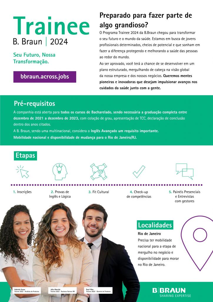 Estamos conduzindo o processo seletivo do Programa de Trainee B. Braun 2024 e gostaria de pedir a ajuda de vocês na divulgação aos alunos e egressos de todos os cursos de graduação.