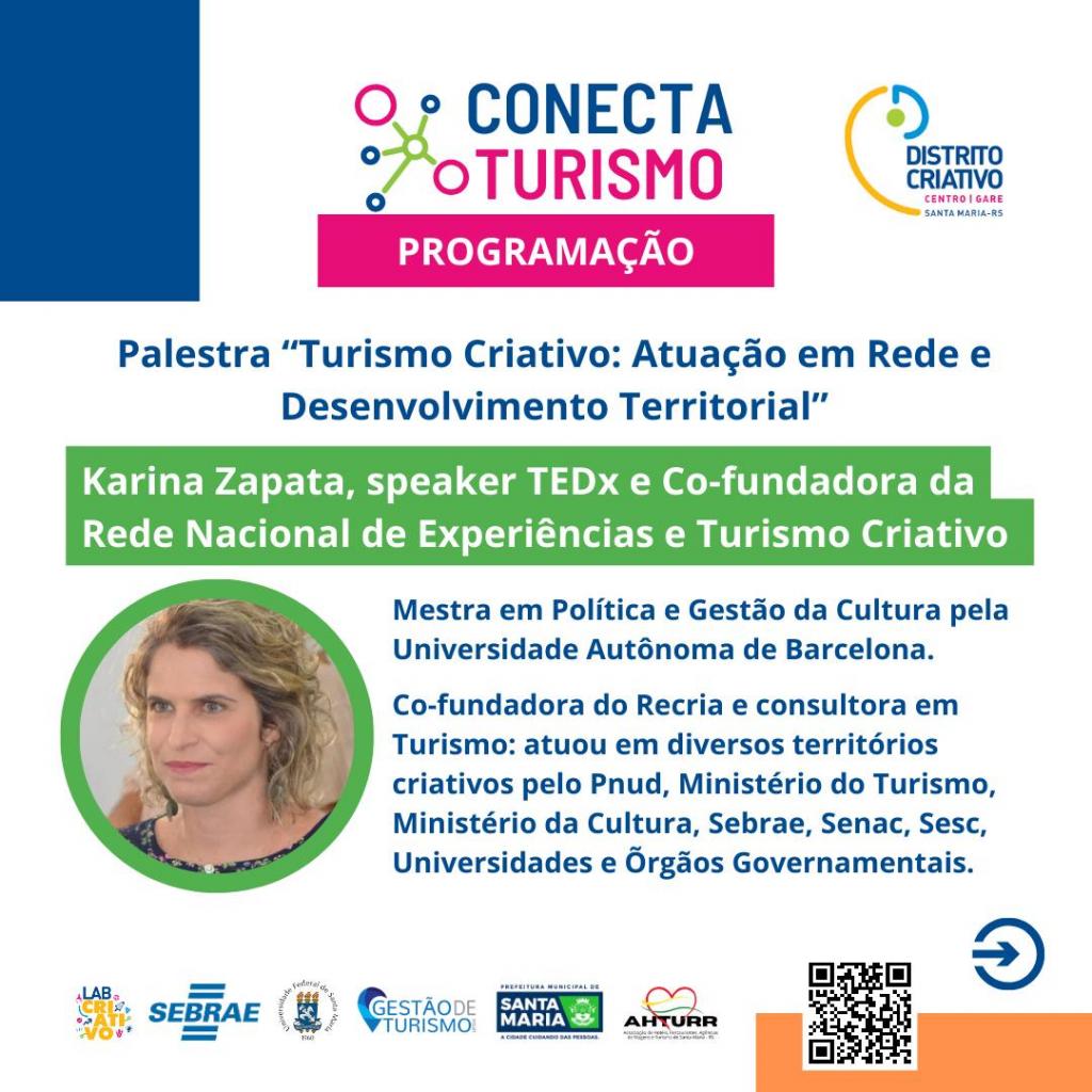• Palestra “Turismo Criativo: Atuação em Rede e Desenvolvimento Territorial”, com Karina Zapata, speaker TEDx e Co-fundadora da Rede Nacional de Experiências e Turismo Criativo (Recria),