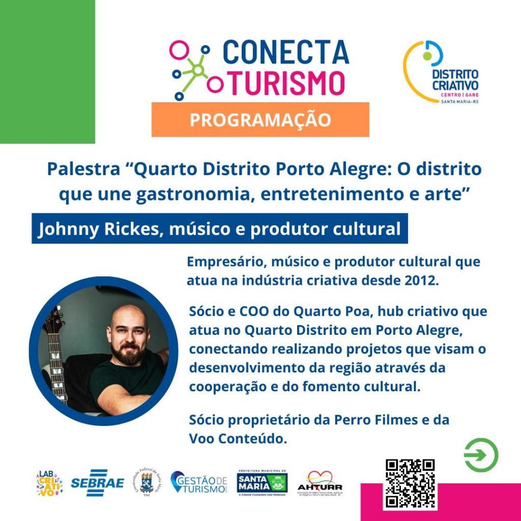 • Palestra “Quarto Distrito Porto Alegre: O distrito que une gastronomia, entretenimento e arte”, com Johnny Rickes, músico produtor cultural que é sócio do Quarto Poa, hub criativo que atua no Quarto Distrito em Porto Alegre.