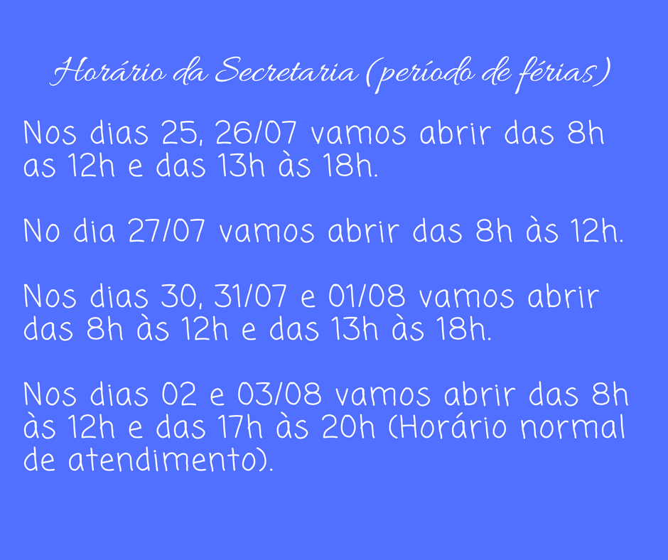 Estão suspensas as aulas de segunda-feira (28/05)Informamos que devido o comunicado da Reitoria, as aulas estarão suspensas até (28/05). Para maiores informações acesse o site.
