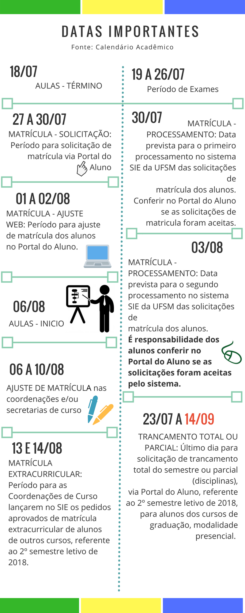 UFSM tem aulas suspensas e expediente administrativo reduzido nos dias de jogos do BrasilAs atividades acadêmicas e o expediente administrativo externo terão alterações em dias de jogos da Seleção Brasileira de Futebol durante o período [...]