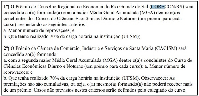 Além dos critérios vigentes acima citados, incluiu-se um critério excludente do aluno ter cursado no máximo nove (9) semestres no caso do Curso Diurno (que tem duração recomendada de oito semestres) e onze (11) semestres no Curso Noturno (que tem duração recomendada em dez semestres). Este critério foi adicionado conforme deliberação do Colegiado do Curso de Ciências Econômicas constante na Ata da 167ª Sessão, aprovando a respectiva sugestão do Núcleo Docente Estruturante acerca dos Critérios de Premiação.