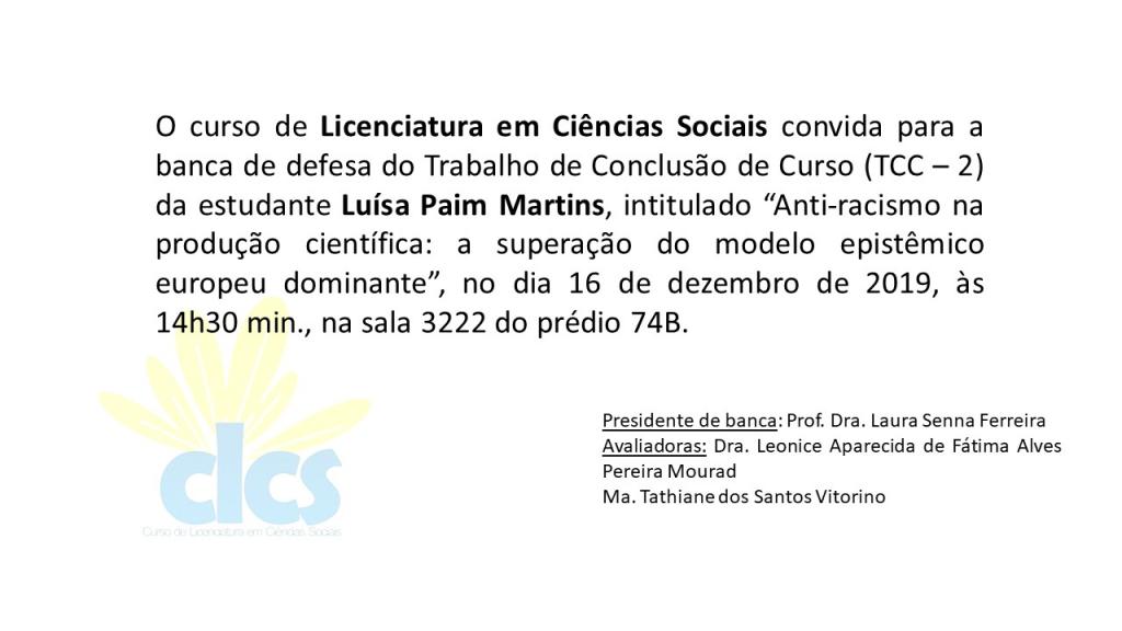 O Curso de Licenciatura em Ciências Sociais convida a todos e todas para as defesas de Trabalho de Conclusão de Curso.