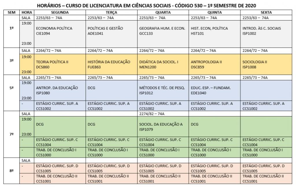 Divulgada a grade de horários com as salas de aula das disciplinas ofertadas neste início de ano pelo curso de Licenciatura em Ciências Sociais.
