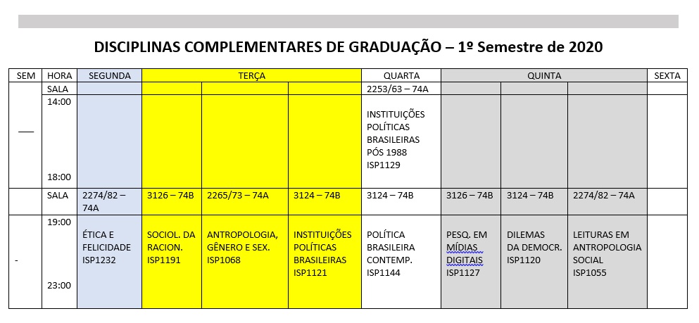 HORÁRIO 2020/ 1º Semestre: Obrigatórias, DCG’s e Aluno Especial I
