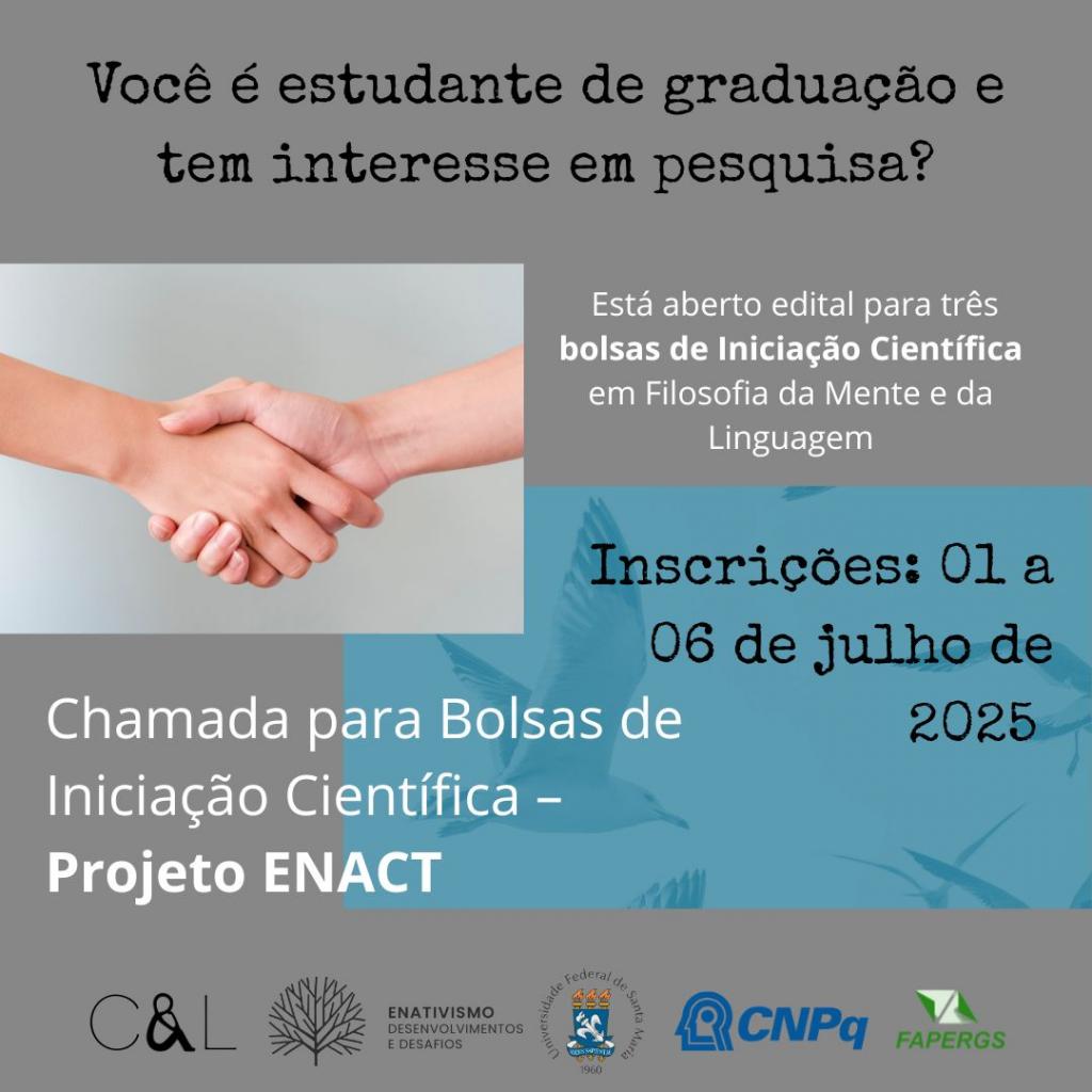 O grupo de pesquisa C&L/Enact convida estudantes interessados em Filosofia da Mente e da Linguagem a se candidatarem à bolsa de iniciação científica vinculada ao projeto em andamento no grupo.