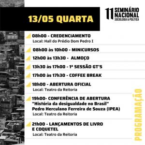 O 11º Seminário Nacional Sociologia & Política ocorrerá nos dias 12 a 15 de maio de 2020 no Setor de Ciências Humanas da Universidade Federal do Paraná na cidade de Curitiba. Esta edição terá como tema “Intermitências da Democracia e Desigualdades Sociais” e promoverá um diálogo entre estudantes, professores e pesquisadores das Ciências Sociais do contexto nacional e internacional.
