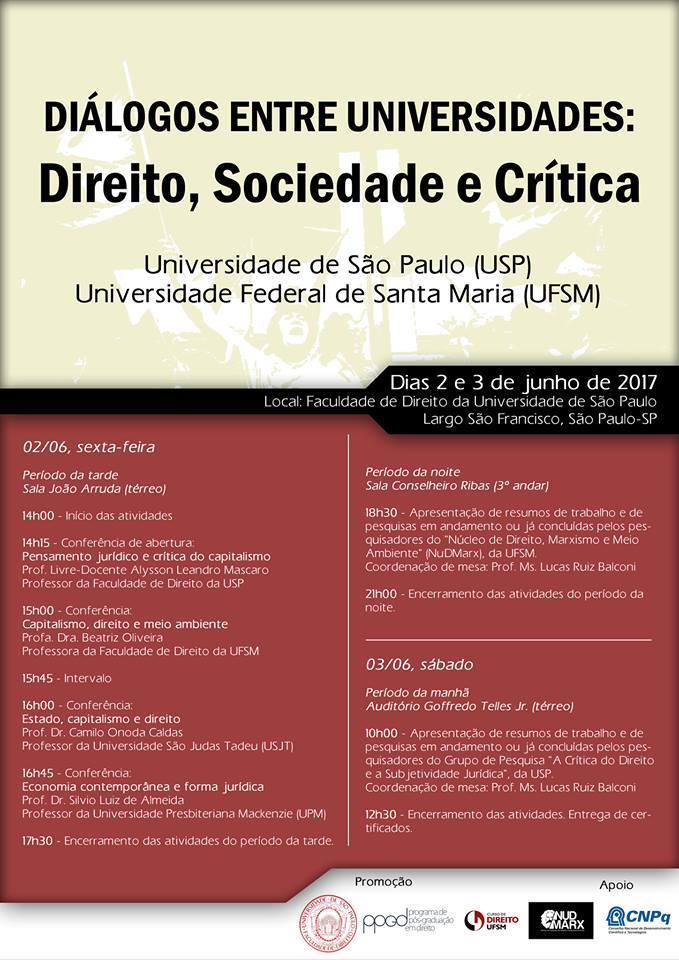 Nos dias 02 e 03 de junho, o Núcleo de Direito, Marxismo e Meio Ambiente (NUDMARX) da Universidade Federal de Santa Maria participou do evento “Diálogos entre Universidades – USP/UFSM – Direito, sociedade e crítica”.