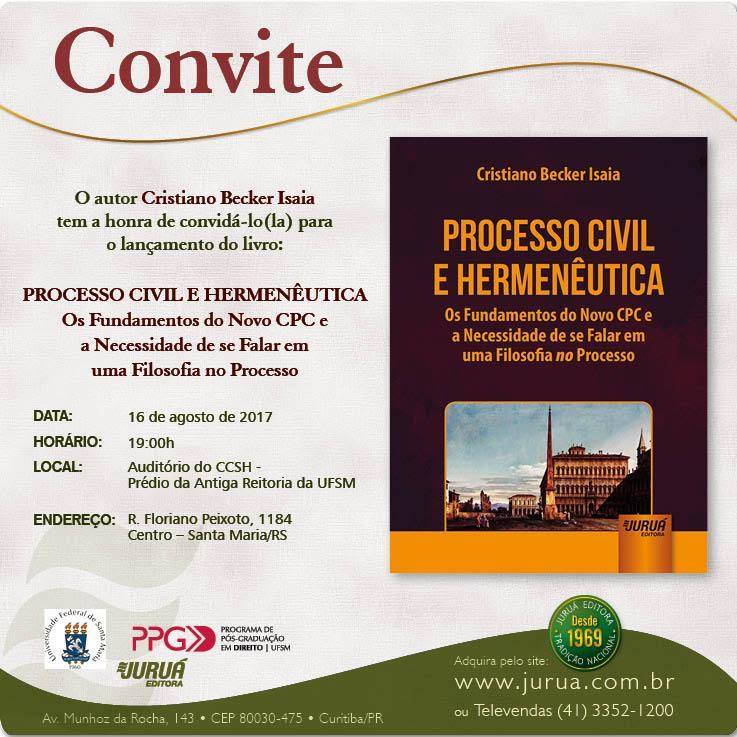 Lançamento do livro: Processo Civil e Hermenêutica – os fundamentos do Novo CPC e a necessidade de se falar em uma filosofia no processo / Cristiano Becker Isaia