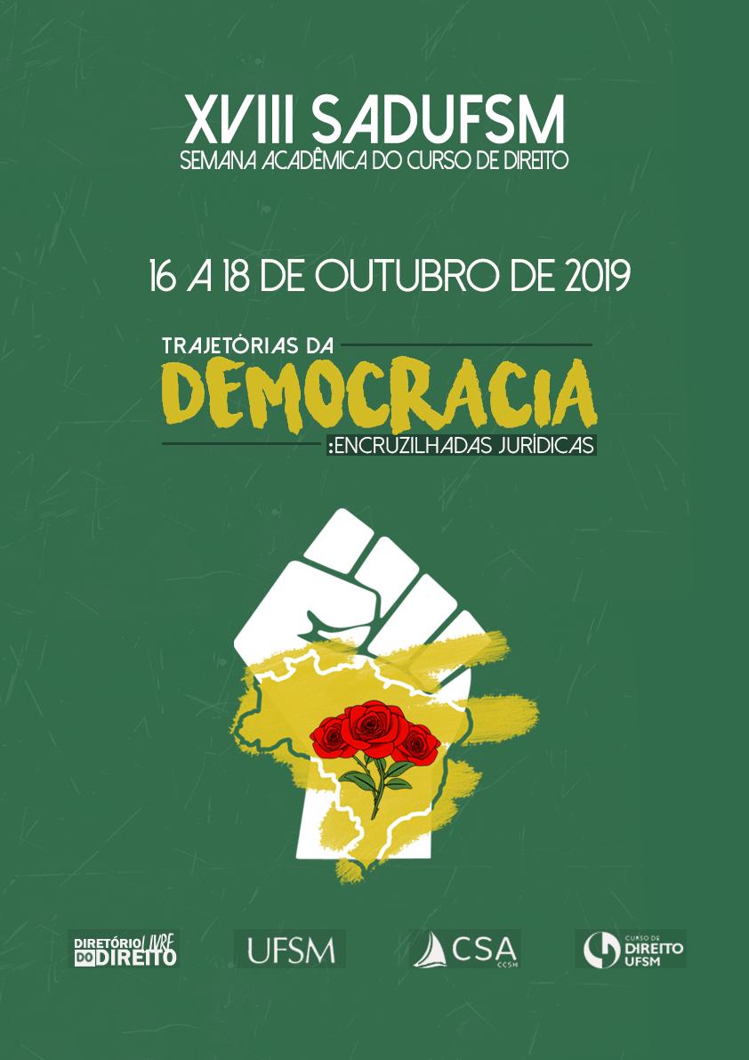 O Diretório Livre do Direito e a Comissão Organizadora da SADUFSM, realizam, nos dias 16,17 e 18 de outubro, a XVIII Semana Acadêmica do Curso de Direito da UFSM, denominada, neste ano, “Trajetórias da Democracia: encruzilhadas jurídicas”. Nesse sentido, com a proposta de gerar discussão acerca de diversos temas em voga no cenário político com reflexos diretos na esfera jurídica, o evento contará com a presença de educadores, juristas e cientistas políticos. Além do mais, também haverá, no dia 18/10, a realização de GTs com temáticas diversas nos quais a comunidade acadêmica poderá expor seus trabalhos.