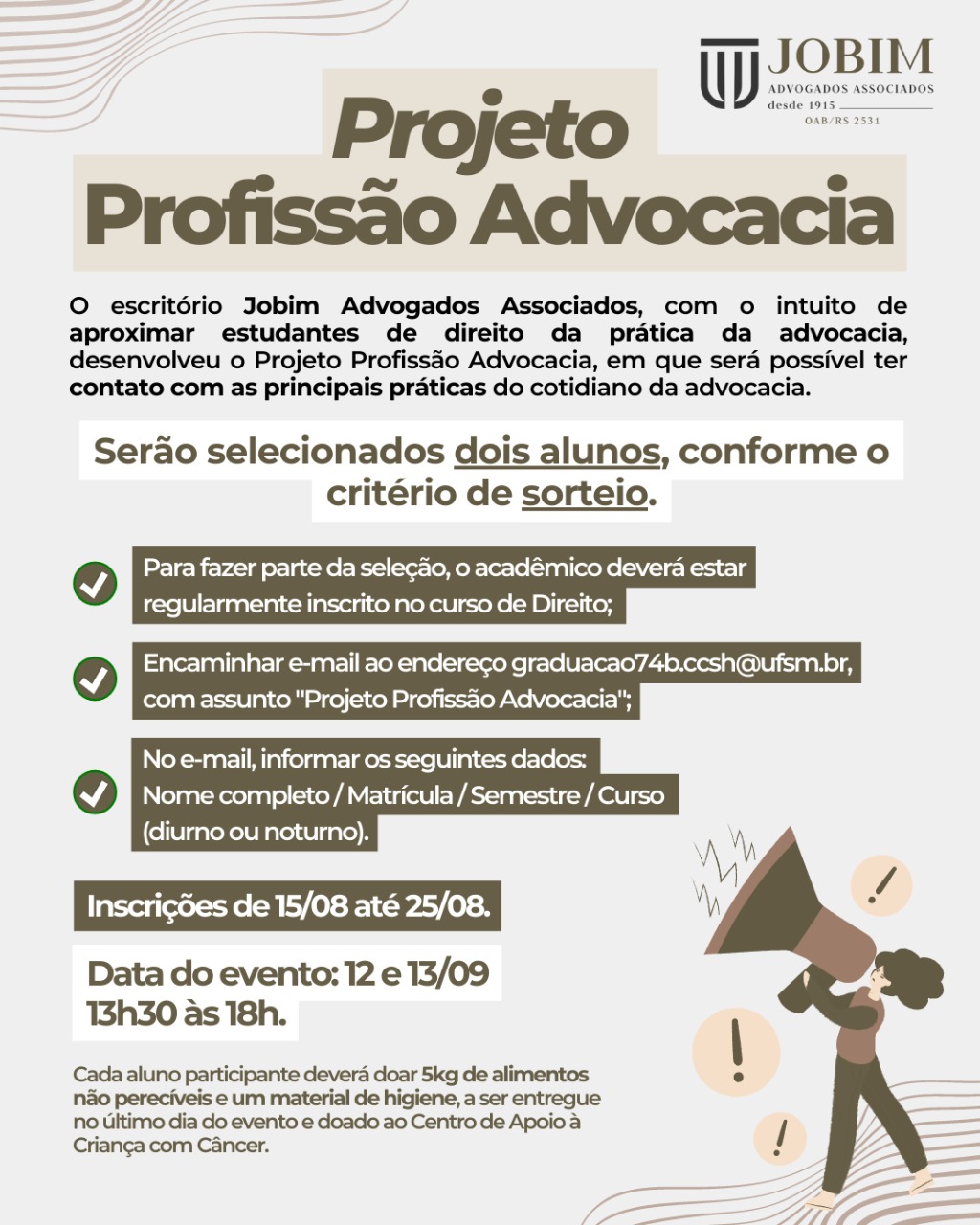 EDITAL 02/2023 PROGRAMA DE EXTENSÃO NÚCLEO INTERDISCIPLINAR DE INTERAÇÃO JURÍDICA COMUNITÁRIA – NIIJuC/DEPARTAMENTO DE DIREITO/CCSH/UFSM NO ÂMBITO DA CHAMADA PARA FOMENTO DE AÇÕES DE EXTENSÃO DA UFSM NO TERRITÓRIODO DISTRITO CRIATIVO CENTRO-GAREA ação de extensão denominada Diplomacia Universitária: Casa das Nações, torna pública a aberturade inscrições para seleção de BOLSISTA para atuar junto [...]