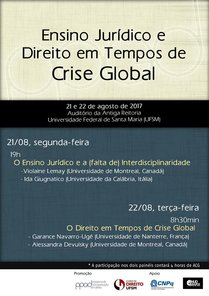 O Curso de Direito, juntamente com Programa de Pós-graduação em Direito da UFSM e em parceria com o grupo de pesquisa NUDIMARX e o Diretório Livre do Direito promoverão nos próximos dias diversas atividades voltadas ao público em geral.