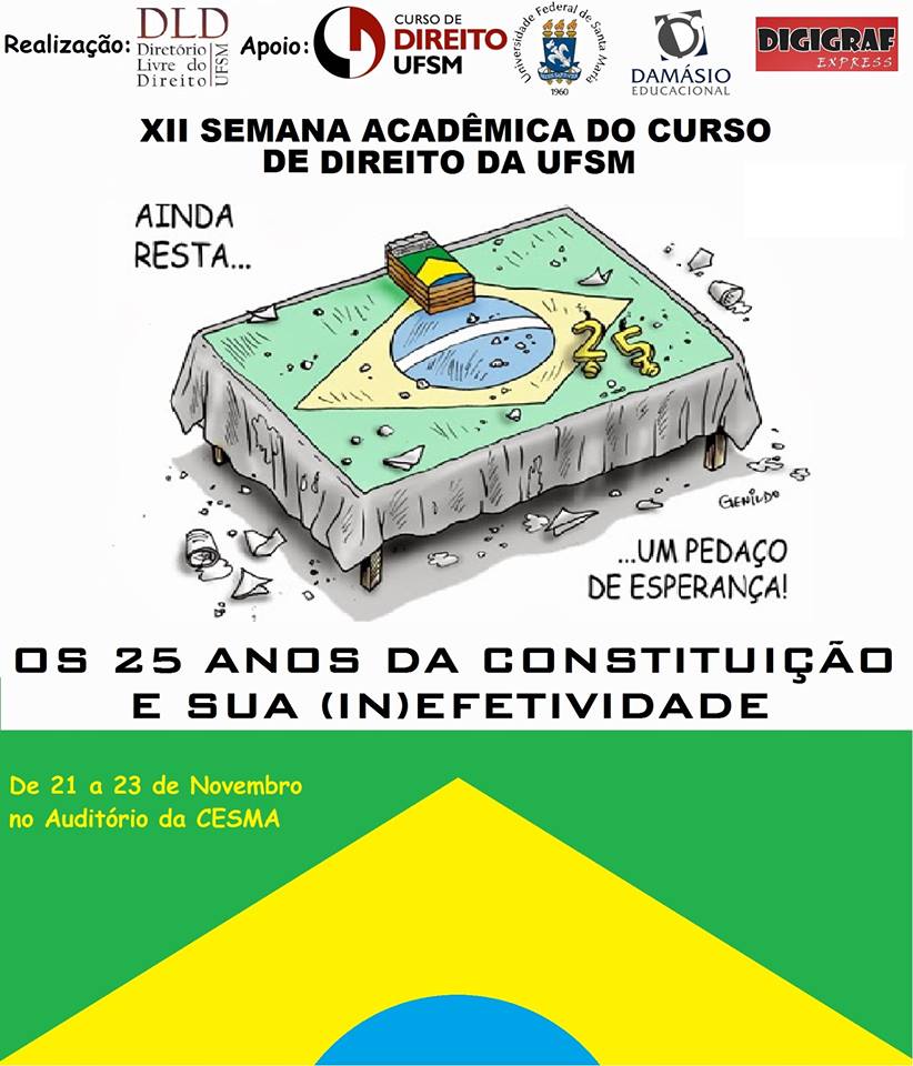 A Semana Acadêmica do Direito é um evento que acontece todos os anos, organizado pelo Diretório Livre do Direito (DLD) da Universidade Federal de Santa Maria (UFSM). Nesse ano ela chega na sua 12ª edição promovendo o debate sobre os 25 anos da Constituição Federal e sua (In)efetividade. Com essa proposta o evento discutirá temas como: