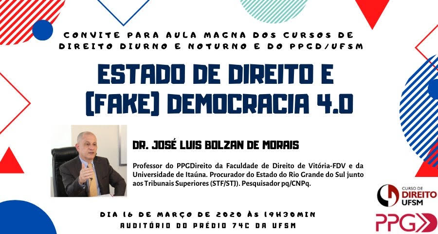 Palestrante: Dr. José Luis Bolzan de Morais – Professor do PPGD da Faculdade de Direito de Vitória – FDV e da Universidade de Itaúna. Procurador do Estado do RS junto aos Tribunais Superiores (STF/STJ), Pesquisador PQ/CNPQ