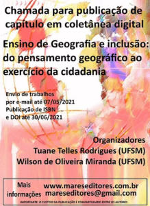 é com grande satisfação que o Professor Doutor Wilson de Oliveira Miranda e a doutoranda Tuane Telles Rodrigues, convidam os professores e alunos do curso de Educação Especial Diurno e Noturno a contribuir no e-book Ensino de Geografia e inclusão: do pensamento geográfico ao exercício da cidadania.