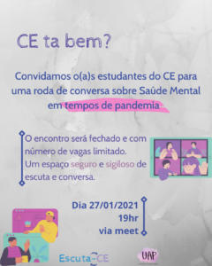 👉 Convidamos o(a)s estudantes do Centro de Educação para  uma roda de conversa para falarmos sobre saúde mental em tempos de pandemia.