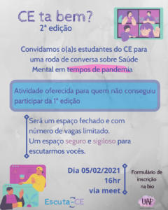 pensando em quem não conseguiu participar da primeira edição, o Escuta-CE oferece um novo horário para a roda de conversa “CE tá bem?” ! 👏 👏 👏