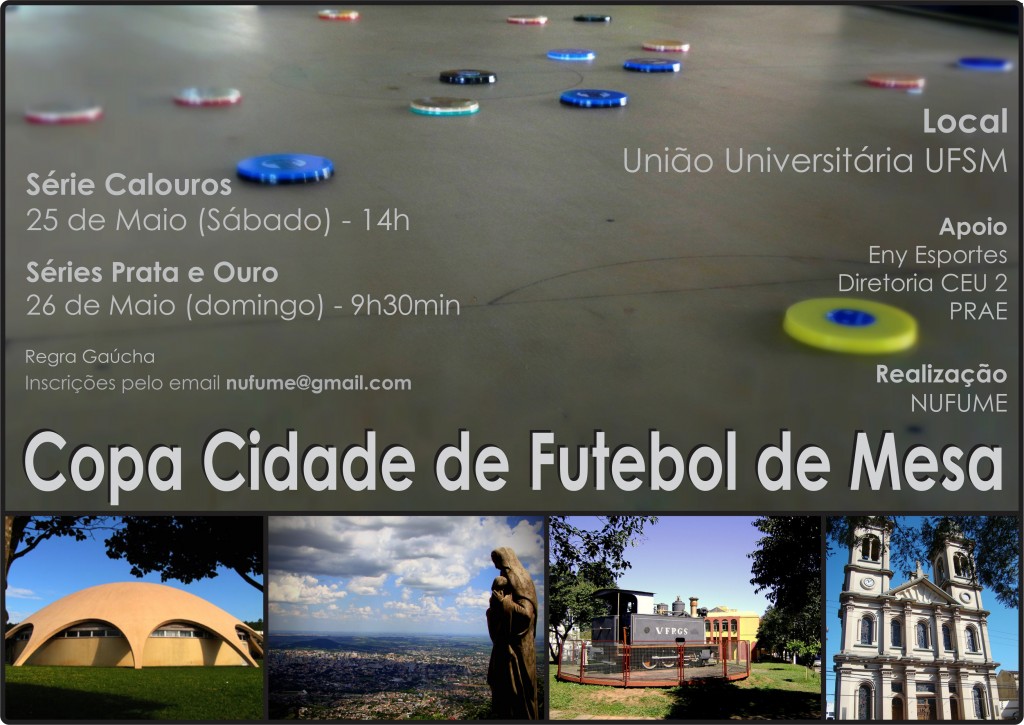 Vem aí a Copa Cidade de Futebol de Mesa. Este ano o evento ocorre nos dias 25 e 26 de maio, na sede do Núcleo Universitário de Futebol de Mesa da UFSM. Fiquem ligados!