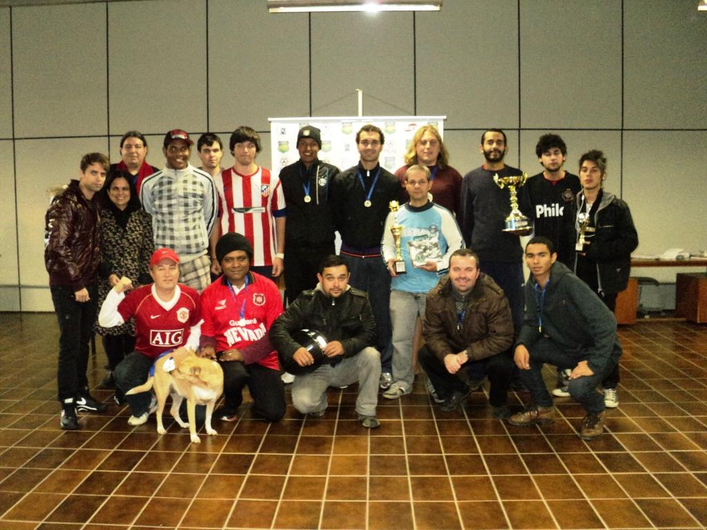O acadêmico de Engenharia Acústica Pedro da Fontoura Kellerman, conduzindo os argentinos do Vélez Sarsfield, foi o grande vencedor da Copa Mariano da Rocha de Futmesa neste fim de semana no Campus da UFSM. Num belo domingo de confraternizações, com direito a um gostoso risoto compartilhado no próprio local e a um bolo patrocinado pelo Andre Bortoloto – torcedor número um do Inter de SM, que completou um ano de inclusão no grupo e ainda sorteou uma caneca do Nufume e uma manta do coloradinho -, vinte atletas começarem cedo a disputa que teve dois momentos marcantes.