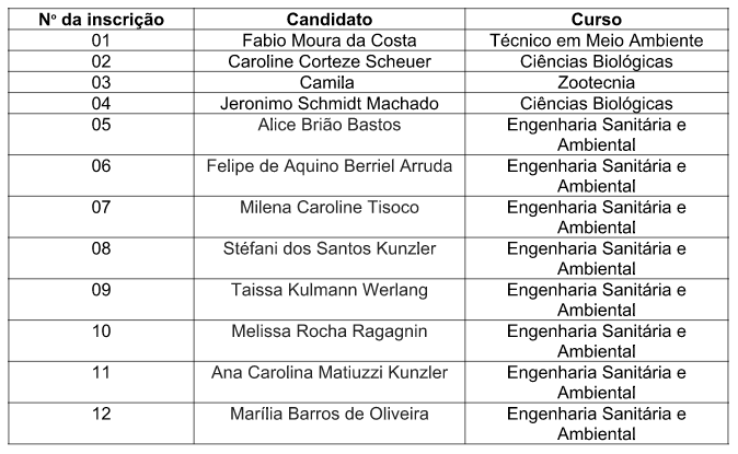 A professora Vanessa Barbisan Fortes, do Departamento de Zootecnia e Ciências Biológicas, comunica aos interessados a homologação das inscrições (seguindo a ordem de inscrição) para bolsas de extensão, financiadas pelo Programa de Extensão Universitária MEC/SESu PROEXT):