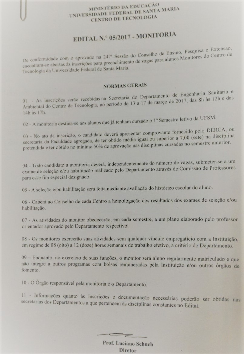 Seleção para professor substitutoO Colégio Politécnico está com edital aberto para seleção de professor subsituto na área de Controle da Poluição/Saneamento Ambiental. A área de [...]