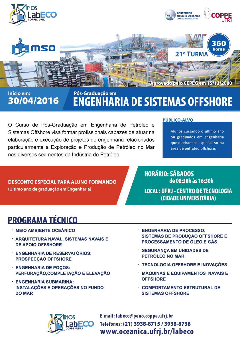 O Departamento de Engenharia Naval e Oceânica da Universidade Federal do Rio de Janeiro, divulga o curso de Especialização em Engenharia de Sistemas Offshore – MSO da COPPE / UFRJ. Estará iniciando a 21a Turma ao final de Abril, com a finalidade de colaborar na formação de engenheiros e alunos do último ano de graduação em Engenharia para entrarem no mercado de trabalho da área naval e offshore.