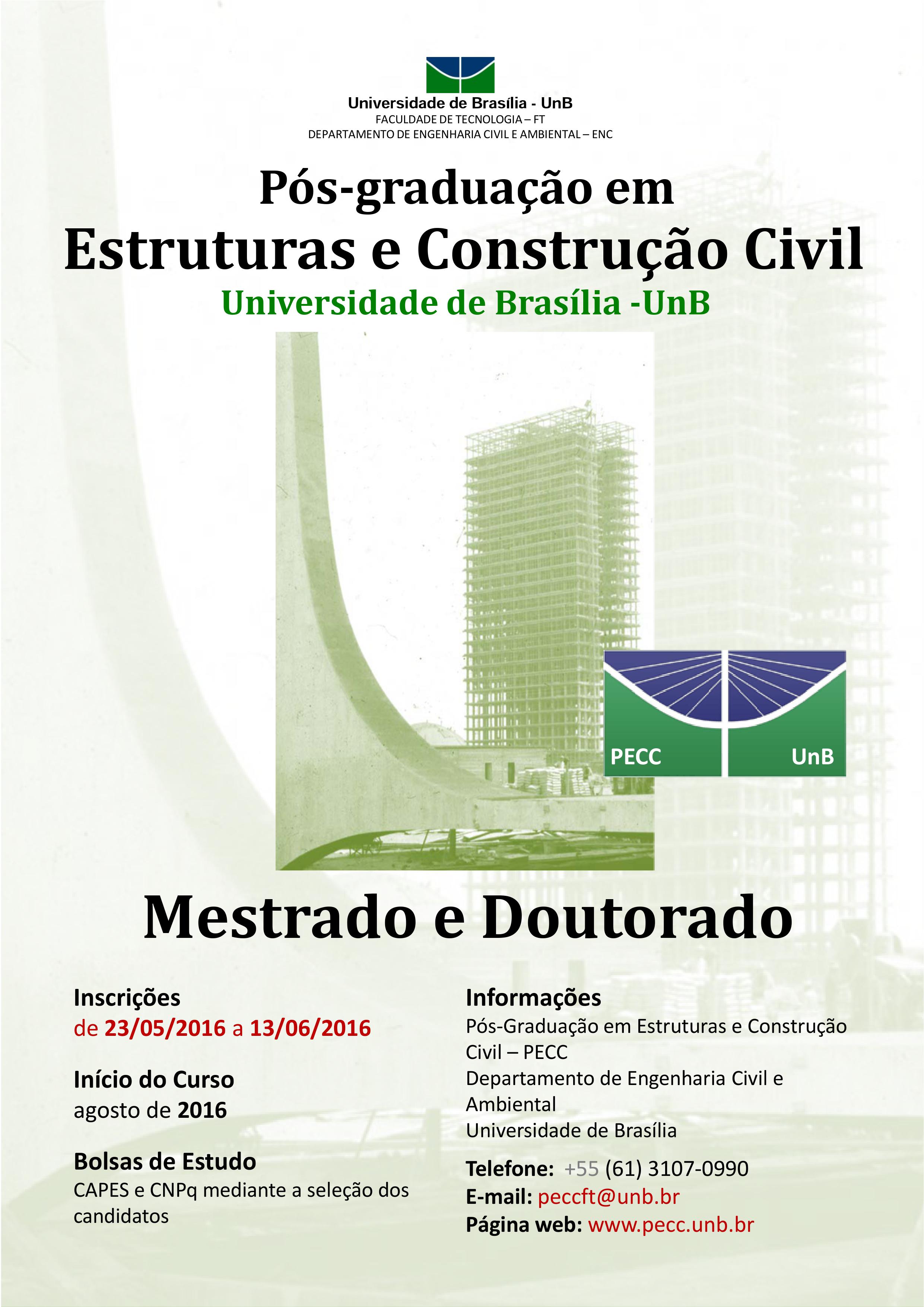O programa de Pós-Graduação em Estruturas e Construção Civil (PECC) da Universidade de Brasília (DF), informa que