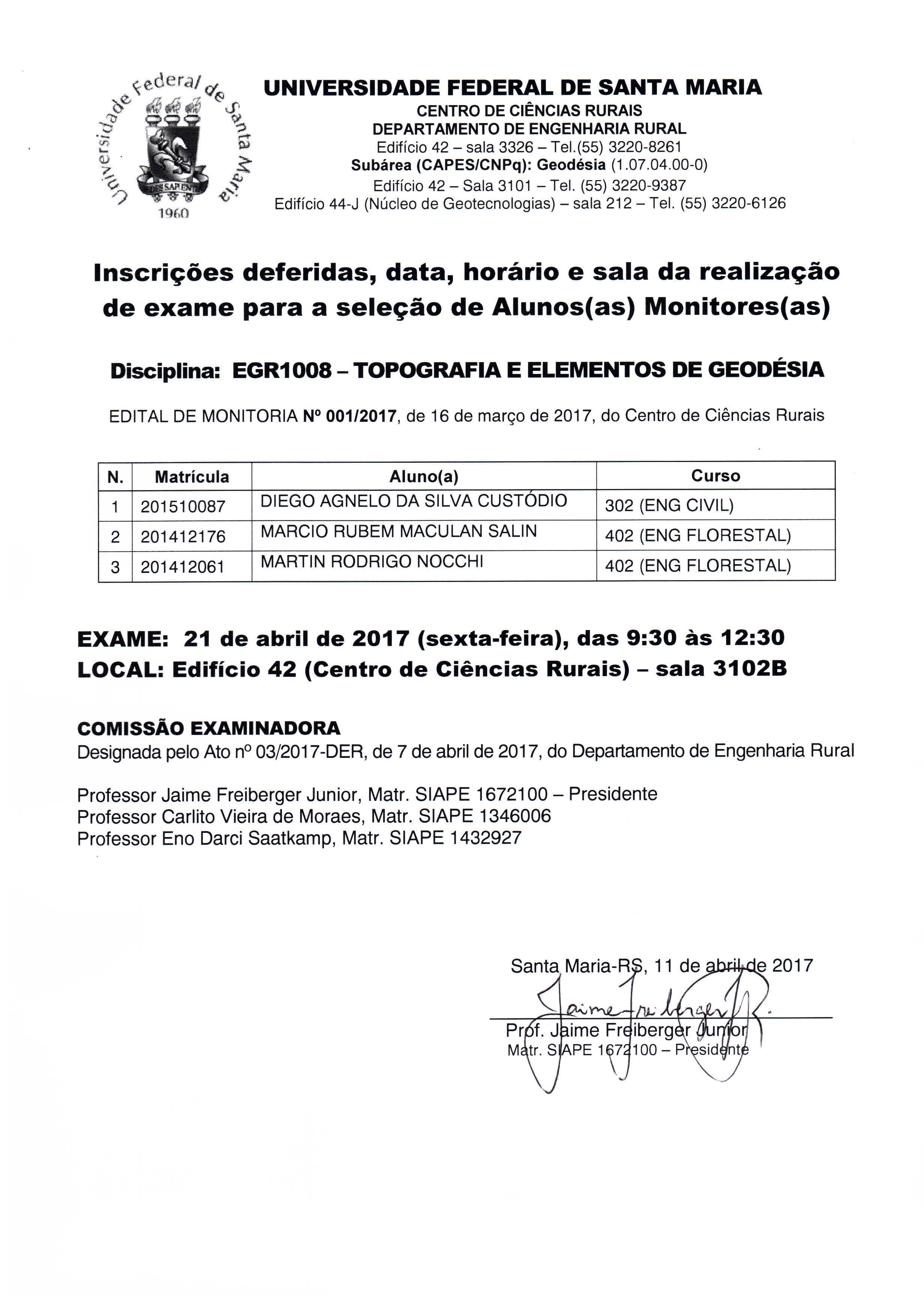 Para verificar as inscrições deferidas na seleção de monitoria para a disciplina EGR1008 – TOPOGRAFIA E ELEMENTOS DE GEODÉSIA, bem como a data, horário e sala de realização do exame: clique aqui.