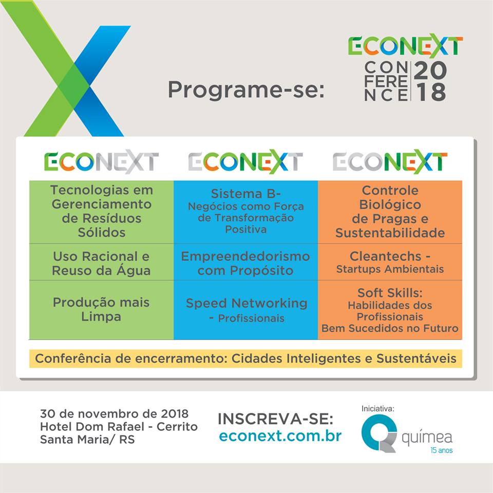 O ECONEXT CONFERENCE 2018, acontecerá no Hotel Dom Rafael Cerrito, em Santa Maria/ RS.  Com uma estimativa de público de aproximadamente 200 pessoas, o evento busca promover a discussão sobre ecoeficiência e tendências de sustentabilidade entre a sociedade e o ambiente, estimulando conexões entre os interessados no tema em comum.