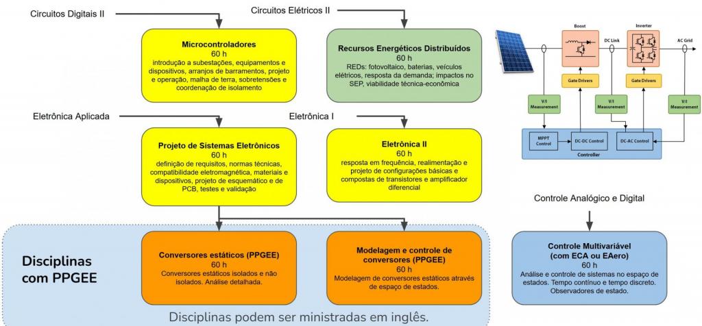 O eixo de Eletrônica de Potência e Controle do PPC 2023 do curso de Engenharia Elétrica possui 2 disciplinas do PPGEE: “Modelagem e Controle de Conversores” e “Conversores Estáticos”. O aluno que optar por esse eixo deverá, preferencialmente, estar vinculado ao GradPG, para que não seja necessário se matricular através de Aluno Especial I.