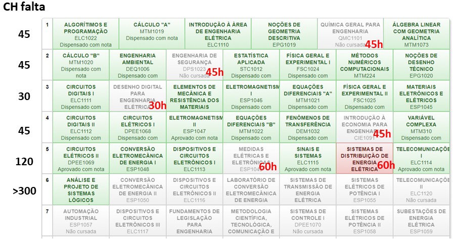 Um aluno proveniente de outra universidade está matriculado no 3° semestre do curso após inscrever-se em Engenharia Elétrica pelo SISU, mas dispensou a maioria das disciplinas até o 5° semestre do curso. Observando a matriz curricular do aluno, faltam as seguintes cargas horárias para finalizar cada um dos semestres, como mostrado na matriz curricular: