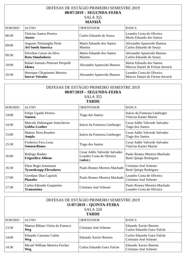 CRONOGRAMA DEFESAS DE ESTÁGIO 2019/1