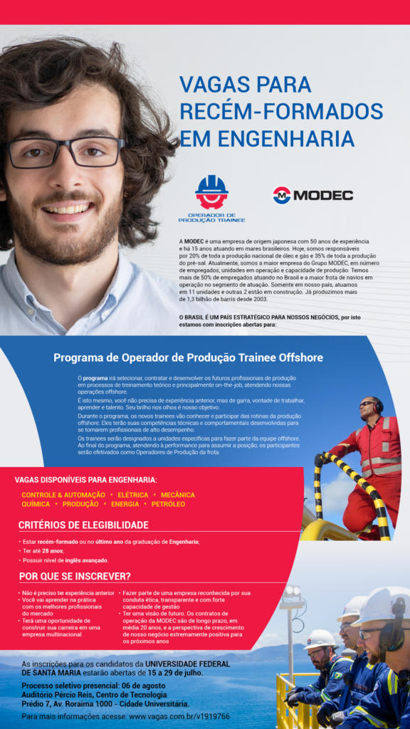 O processo seletivo ocorrerá no dia 06 de agosto, no Auditório Pércio Reis. A programação completa será divulgada conforme recebermos informações da empresa.