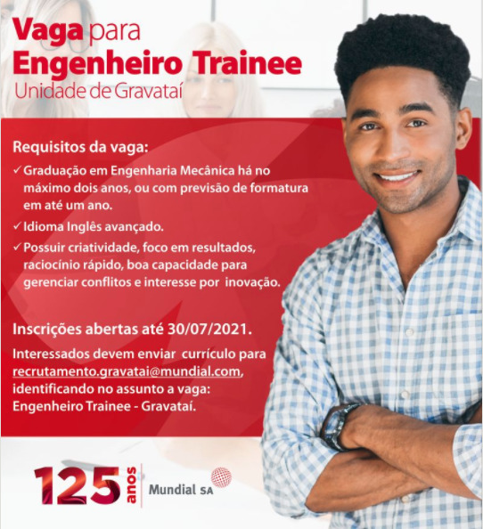 Enviar currículo para o e-mail: recrutamento.gravatai@mundial.com com assunto: Engenheiro Trainee – Gravataí.
