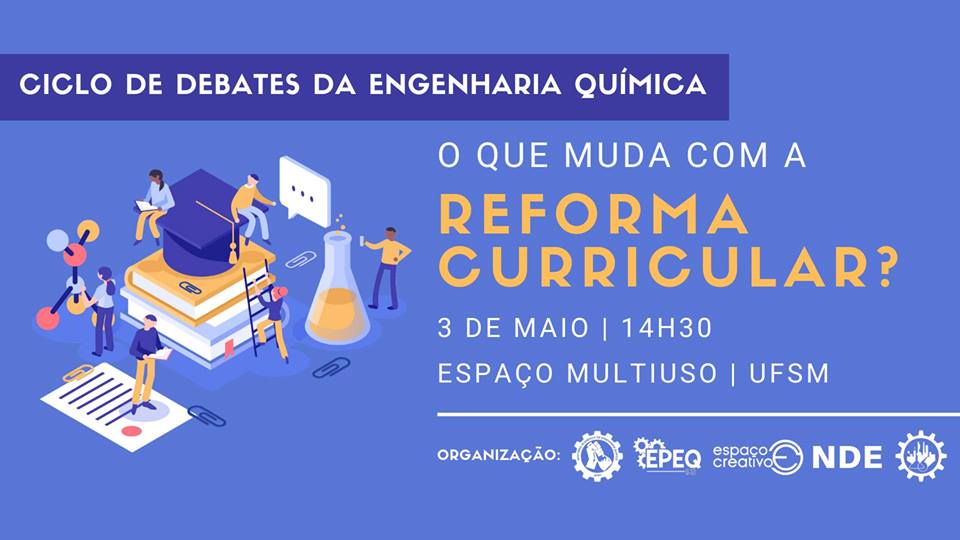 O DAEQ, a EPEQ, o Espaço CrEativo, o NDE e a Coordenação de Curso estão organizando o evento “O que muda com a Reforma Curricular?”, que ocorrerá no dia 03/05/2019, no Espaço Multiuso da UFSM.