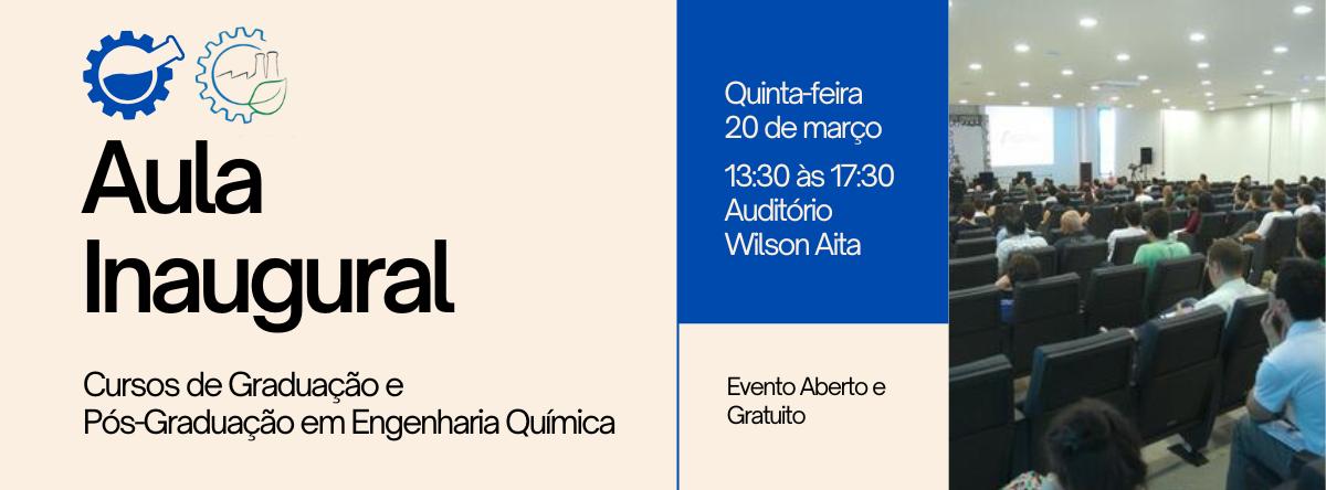 | 13:30 | Boas-vindas das Coordenações dos Cursos de Graduação e Pós-graduação em Engenharia Química. Apresentação dos Palestrantes da Aula Inaugural. |