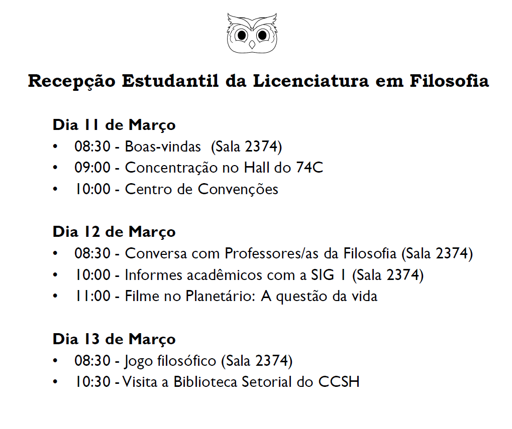 A Coordenação da Licenciatura em Filosofia e o Centro Acadêmico de Filosofia (CAFIL), convida para a recepção das/dos estudantes que estão ingressando no curso de Licenciatura em Filosofia em 2024.