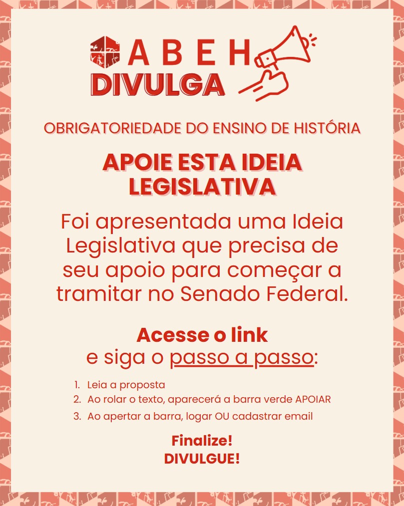 A Associação Brasileira de Ensino de História (ABEH) vem a público divulgar uma Ideia Legislativa que tem como proposta tornar obrigatórias as disciplinas de História, Geografia, Sociologia e Filosofia em todos os anos do Ensino Médio, a partir de 2026, com um mínimo de duas aulas semanais para cada componente curricular.