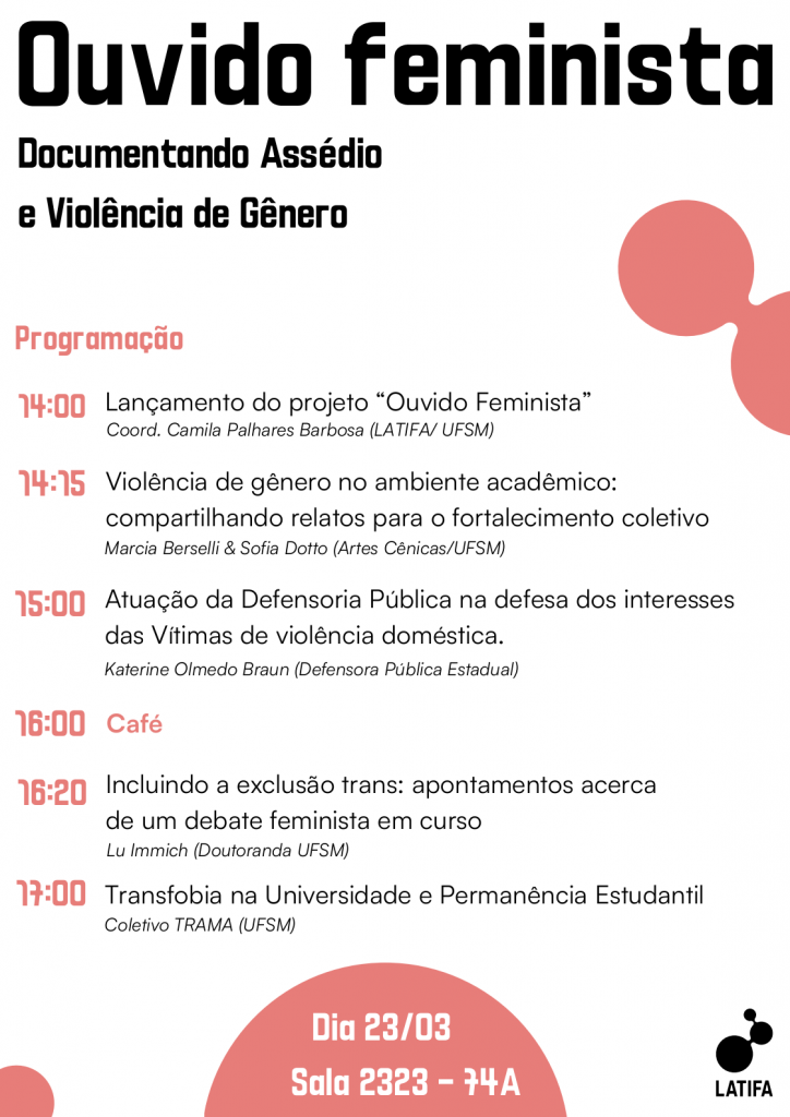 O grupo LATIFA (Laboratório de Ações e Teorias Interseccionais, Feministas e Antirracistas) convida a comunidade para o evento “Ouvido Feminista: documentando assédio e violência de gênero”, que ocorrerá no dia 23/03, às 14h, na sala 2323 do prédio 74A.