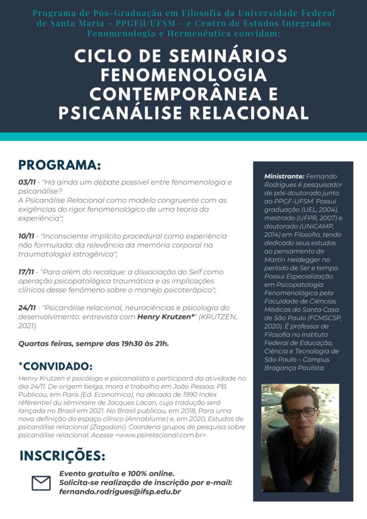 O Programa de Pós-Graduação em Filosofia da Universidade Federal de Santa Maria – PPGFil/UFSM e Centro de Estudos Integrados Fenomenologia e Hermenêutica gostariam de convidar a comunidade acadêmica para prestigiarem o evento Ciclo de Seminários Fenomenologia Contemporânea e Psicanálise Relacional, que ocorrerá de 03 a 24 de novembro, sempre às quartas-feiras, das 19:30 h às 21:00 h.