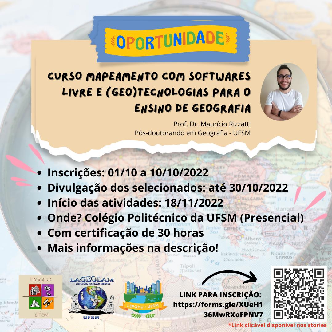 O curso “Mapeamentos com softwares livres e (Geo)tecnologias para o Ensino de Geografia” tem por objetivo fornecer uma formação continuada a docentes de Educação Básica frente ferramentas tecnológicas que podem ser inseridas no Ensino de Geografia durante suas atuações profissionais. Os softwares abordados no curso, a saber QGIS, Google Earth, Philcarto, Image Composite Editor, StereophotoMaker, Earth Viewer, Biome Viewer e Windy, apresentam uma potencialidade significativa para serem utilizados em aulas de Geografia na Educação Básica, visto que podem serem aplicados para ilustrar determinado conteúdo e/ou para manuseio dos estudantes.