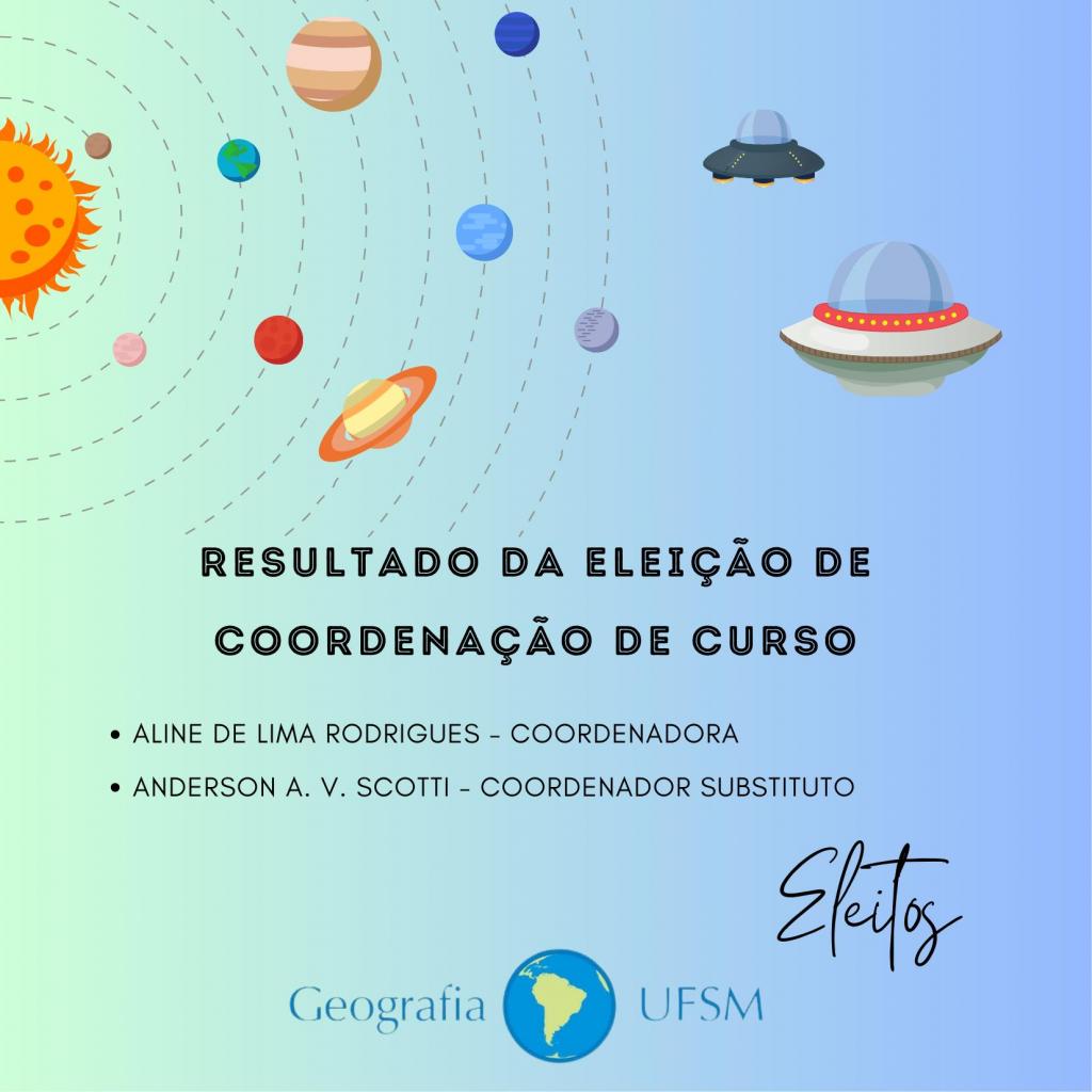A comissão eleitoral, no uso de suas atribuições legais, divulga o resultado das eleições para a coordenação dos cursos de Geografia Bacharelado e Geografia Licenciatura.