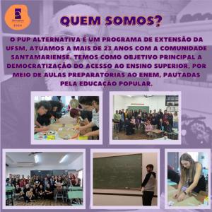 O P.U.P Alternativa é um programa de extensão da UFSM vinculado a Pró Reitoria de Extensão (PRE), ao Laboratório de Metodologia de Ensino (LAMEN) e ao Observatório de Direitos Humanos da UFSM (ODH).