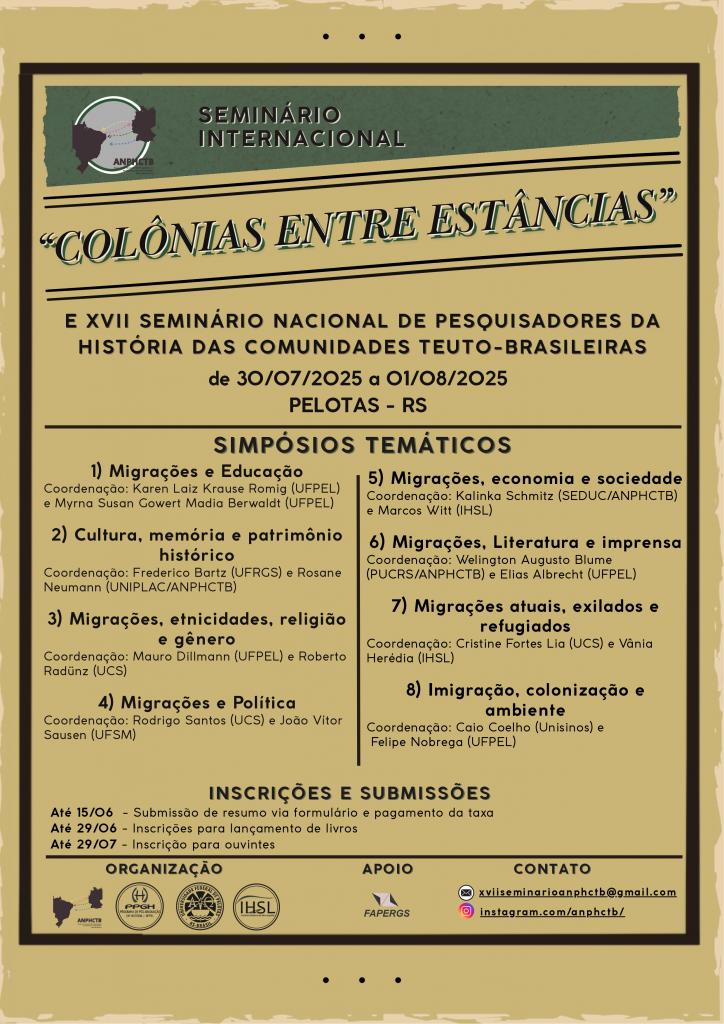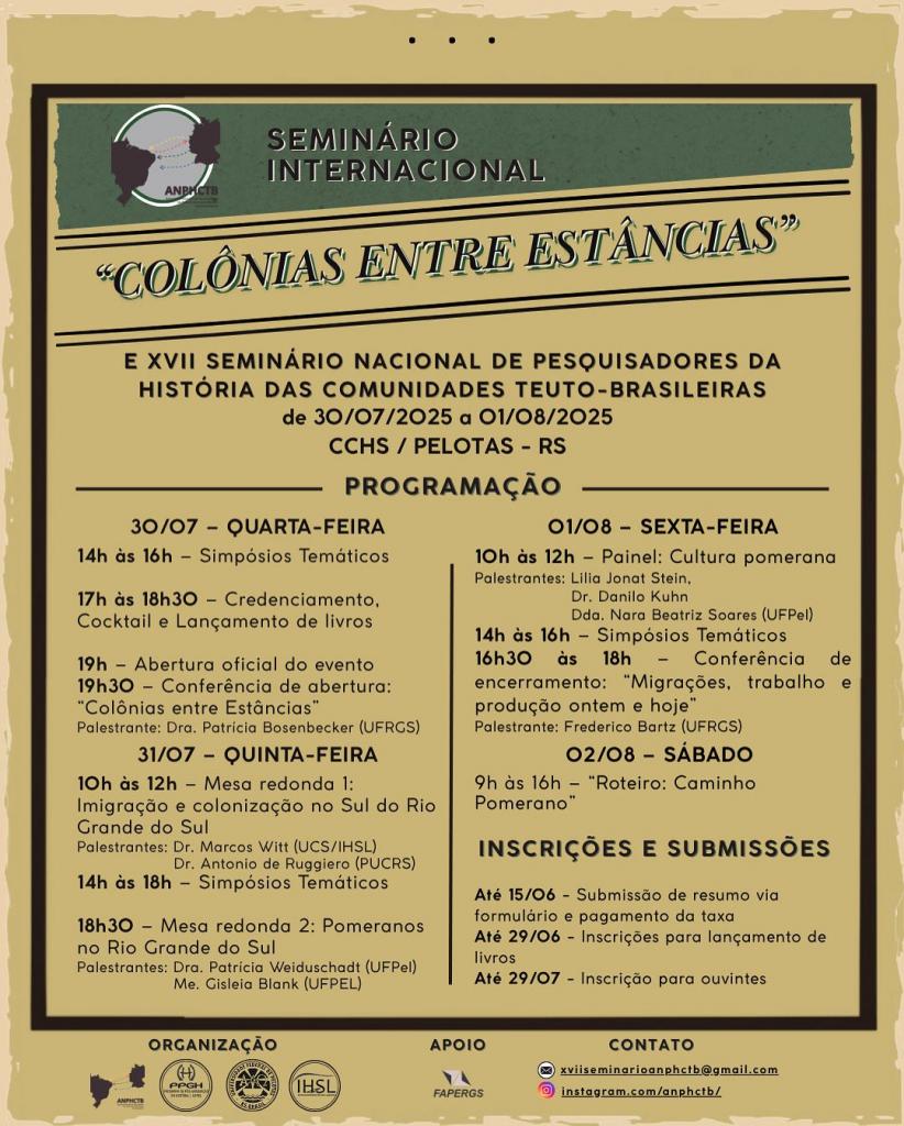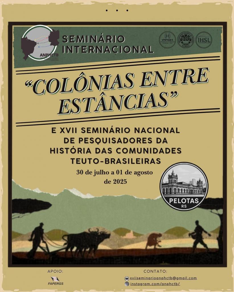 O Seminário Internacional “Colônias entre estâncias” e o XVII Seminário Nacional de Pesquisadores da História das Comunidades Teuto-Brasileiras será realizado na Universidade Federal de Pelotas (UFPEL), em Pelotas/RS, entre os dias 30 de julho e 1º de agosto de 2025.