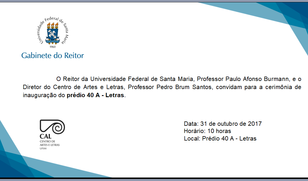 O Reitor da Universidade Federal de Santa Maria, Professor Paulo Afonso Burmann, e o Diretor do Centro de Artes e Letras, Professor Pedro Brum Santos, convidam para a cerimônia de inauguração do Prédio 40 A – Letras.
