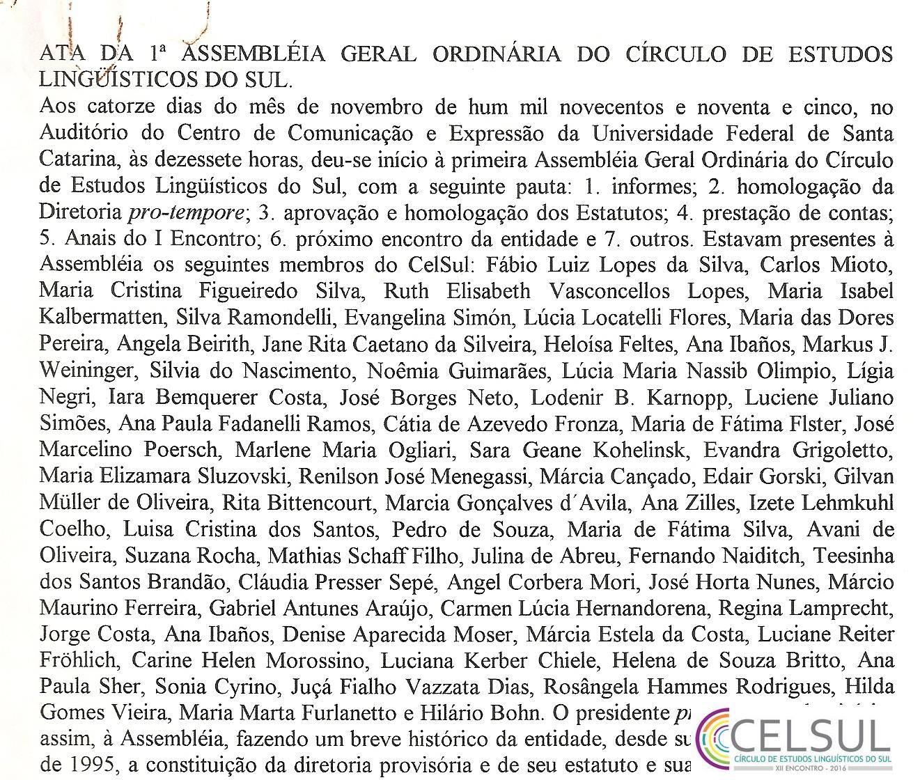 Na primeira Assembleia Geral Ordinária do Círculo de Estudos Linguísticos do Sul, realizada em 14 de novembro de 1995, foi aprovado e homologado o Estatuto do CELSUL que se constituiu como uma sociedade civil, sem fins lucrativos, destinada a reunir pesquisadores e estudiosos em Linguística com o objetivo de divulgar suas pesquisas em eventos científicos bienais.