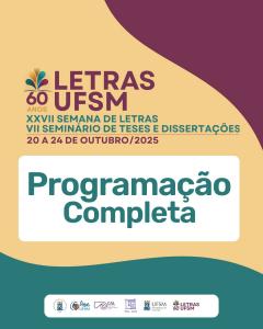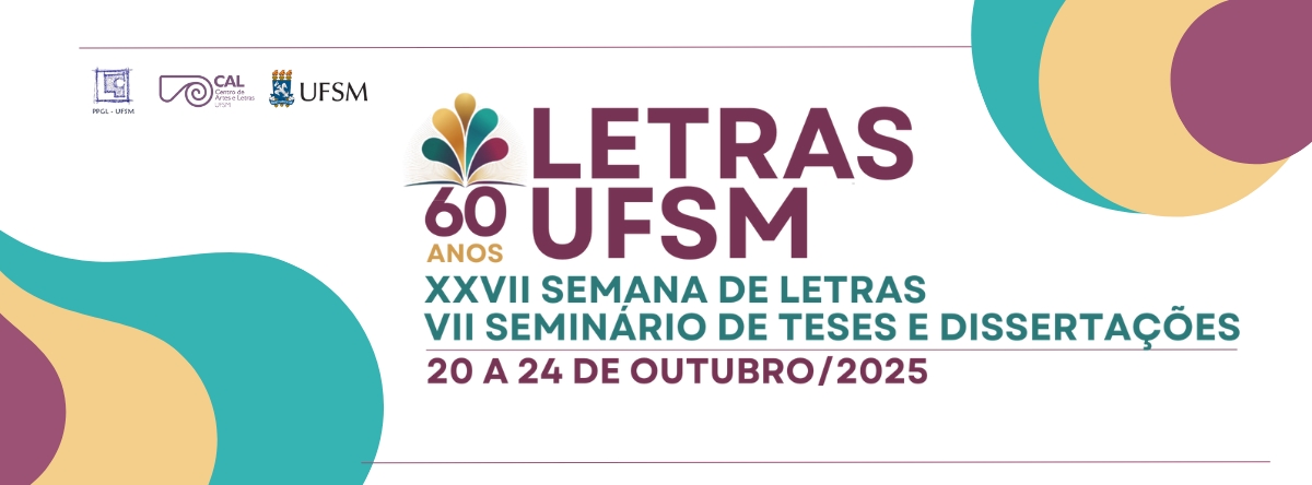 Com muita alegria, anunciamos que, a XXVII Semana de Letras da UFSM e o VII Seminário de Teses e Dissertações (SETEDI) ocorrerão presencialmente entre os dias 20 e 24 de outubro de 2025 e se integram para comemorar os 60 anos do Curso de Letras da Universidade Federal de Santa Maria. As inscrições tanto para ouvintes quanto para comunicação oral são gratuitas.