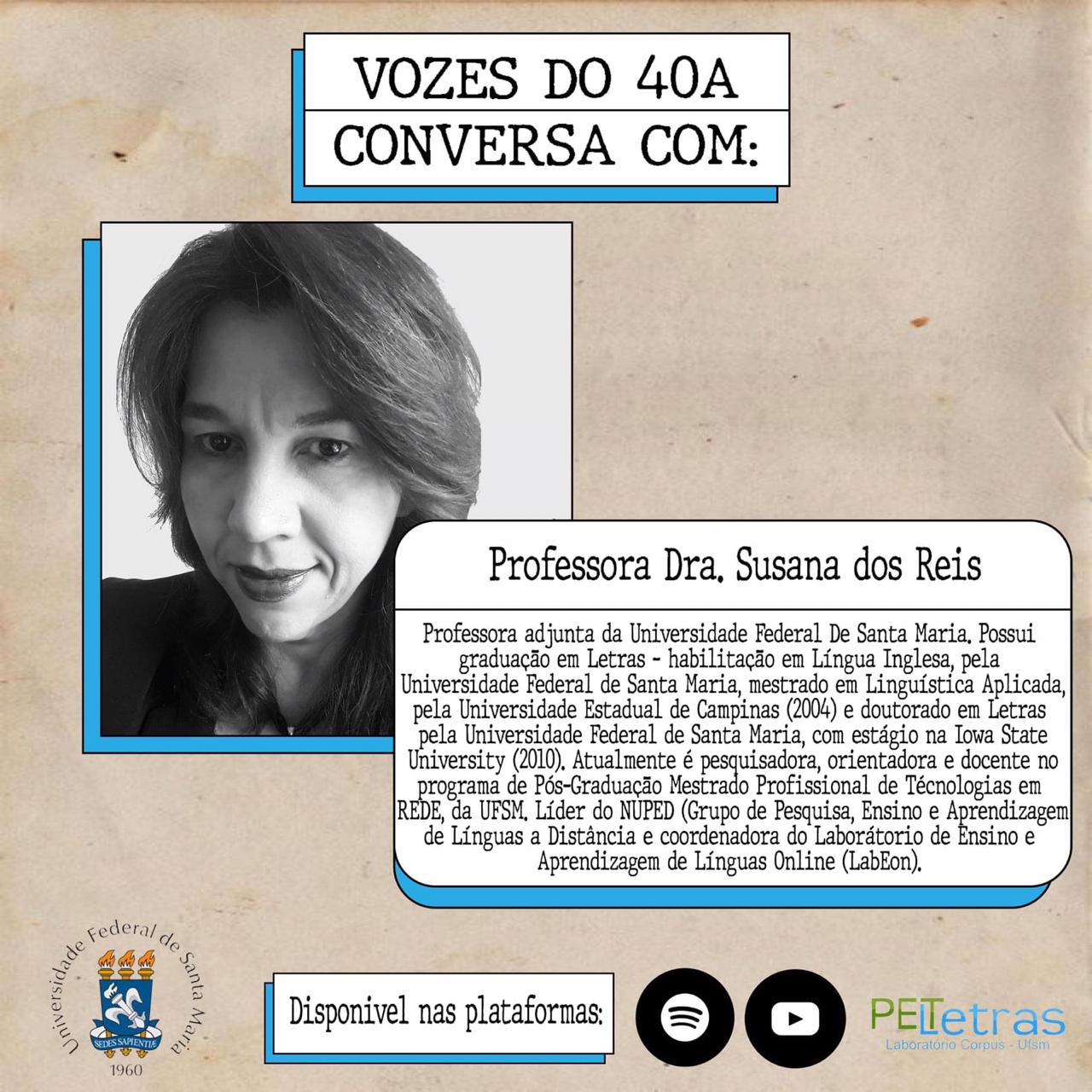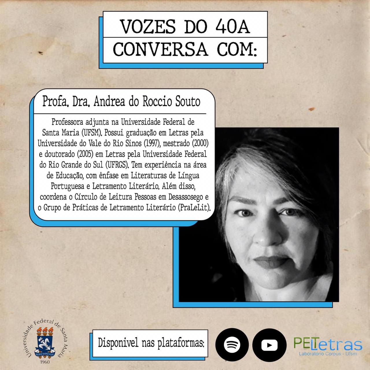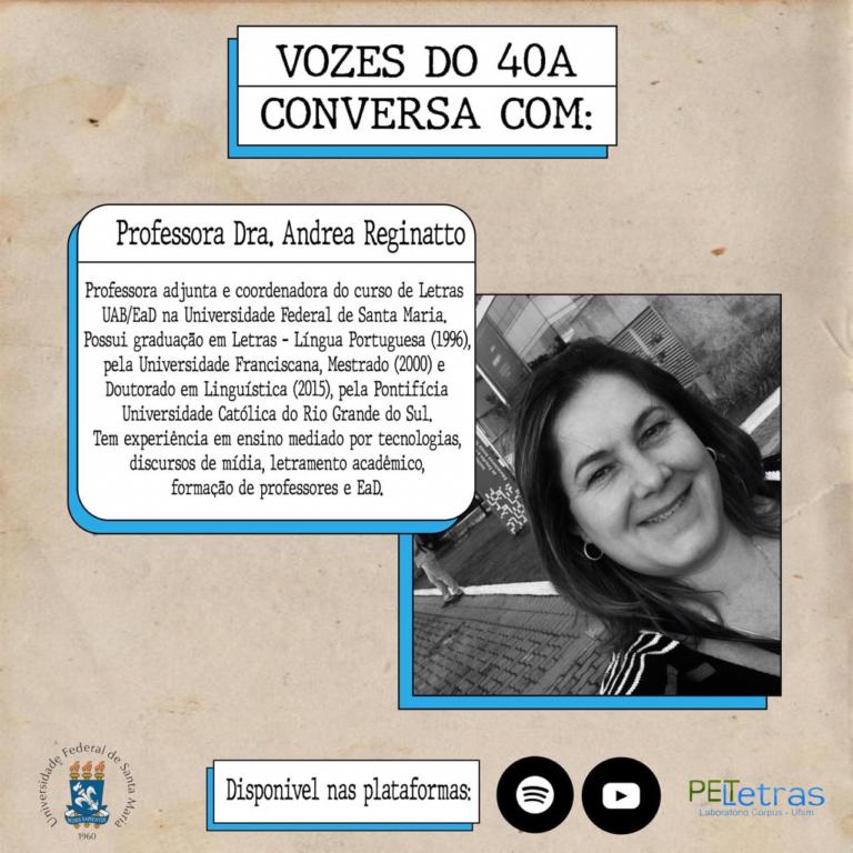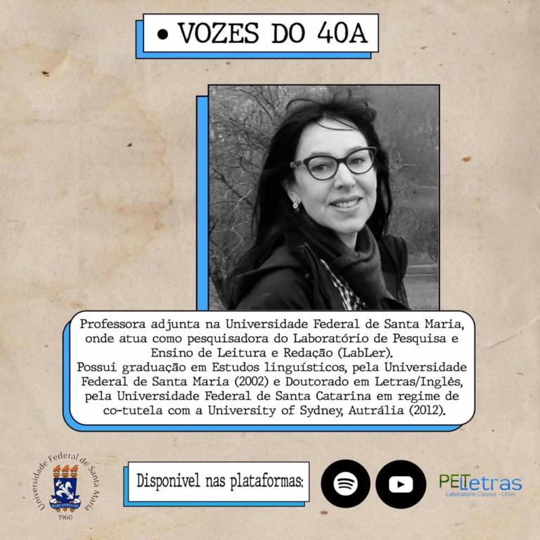 O podcast Vozes do 40A é uma produção do Programa de Educação Tutorial (PET Letras), da Universidade Federal de Santa Maria (UFSM). O objetivo do podcast é integrar os graduandos e os professores dos cursos de Bacharelado e Licenciatura em Letras, por meio de uma conversa informal, que versa não só sobre a produção acadêmica do professor, mas também sobre seus interesses extra sala de aula.
