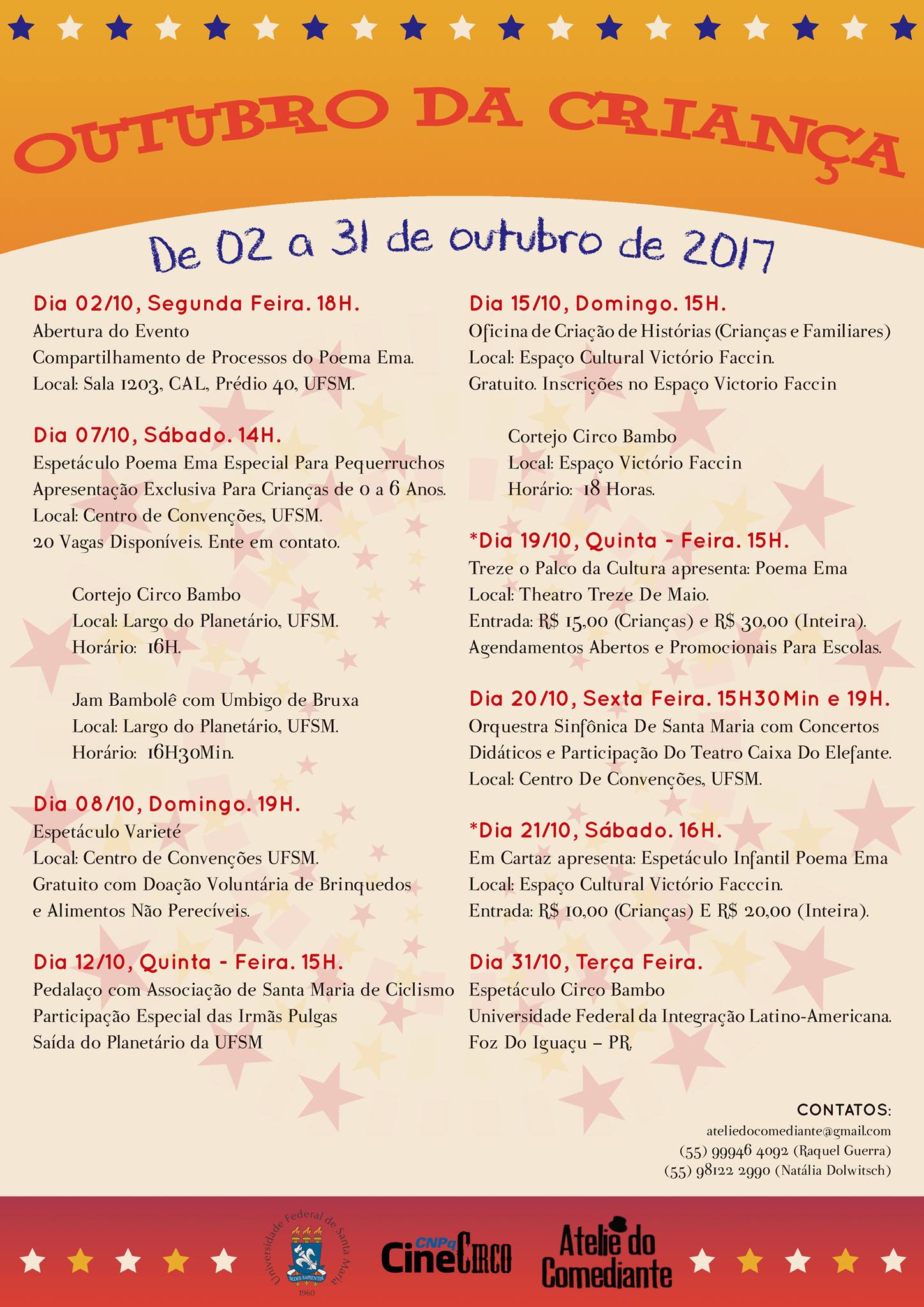 Informações sobre o evento e agendamentos pelo email ateliedocomediante@gmail.com ou diretamente por telefone com as organizadoras do evento: